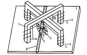 旋轉(zhuǎn)磁化屬于復(fù)合磁化(多向磁化)。如圖1所示,它是利用兩相或多相磁場(chǎng)相互疊加而形成的合成磁場(chǎng)對(duì)工件進(jìn)行磁化的,交叉磁軛可以形成旋轉(zhuǎn)磁場(chǎng)。它的四個(gè)磁極分別由兩相具有一定相位差的正弦交變電流激磁。如圖2所示,于是就能在四個(gè)磁極所在平面形成與激磁電流頻率相等的旋轉(zhuǎn)著的(合成)磁場(chǎng),旋轉(zhuǎn)磁場(chǎng)因此而得名。